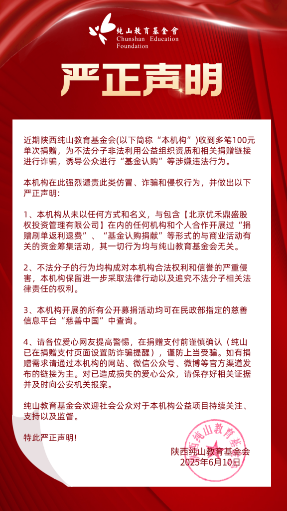 纯山教育基金会是2006年9月经陕西省民政厅批准设立的公益基金会,2013年首次被陕西省民政厅评为4A级社会组织。2017年5月获陕西省首批慈善组织认定,同年11月,获得公开募捐资格。纯山关注6-20岁乡村青少年的教育及发展问题,秉持“以人为本”的教育理念,支持教育改善类的公益行动,希望通过提供物资补充、能力建设及培训帮助这些孩子成长为独立自信、自强互助的青少年。